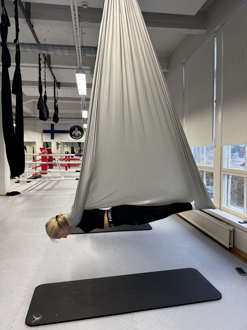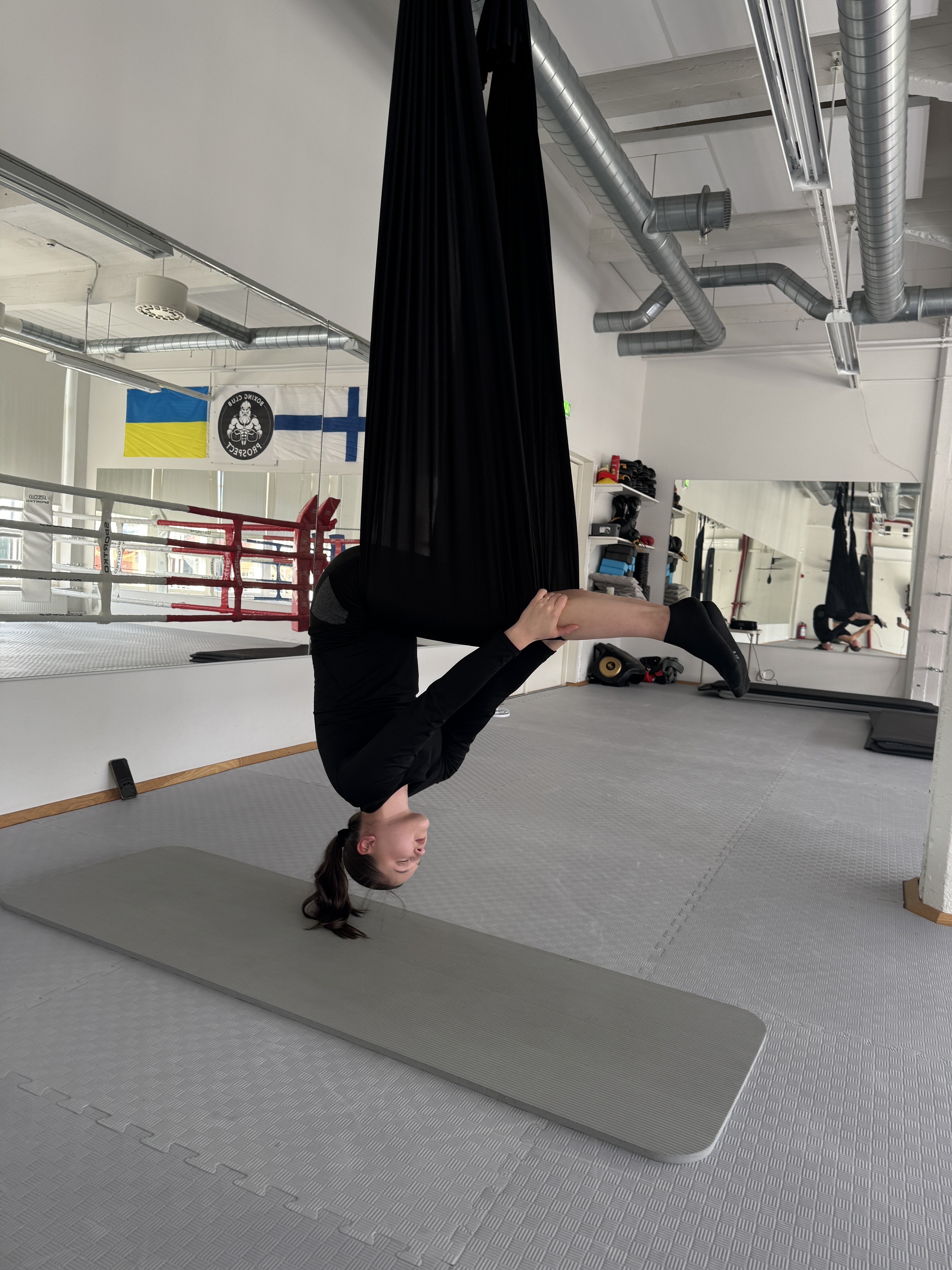 Aerial hammock classes help develop strength, flexibility, coordination, balance, and self-confidence.
