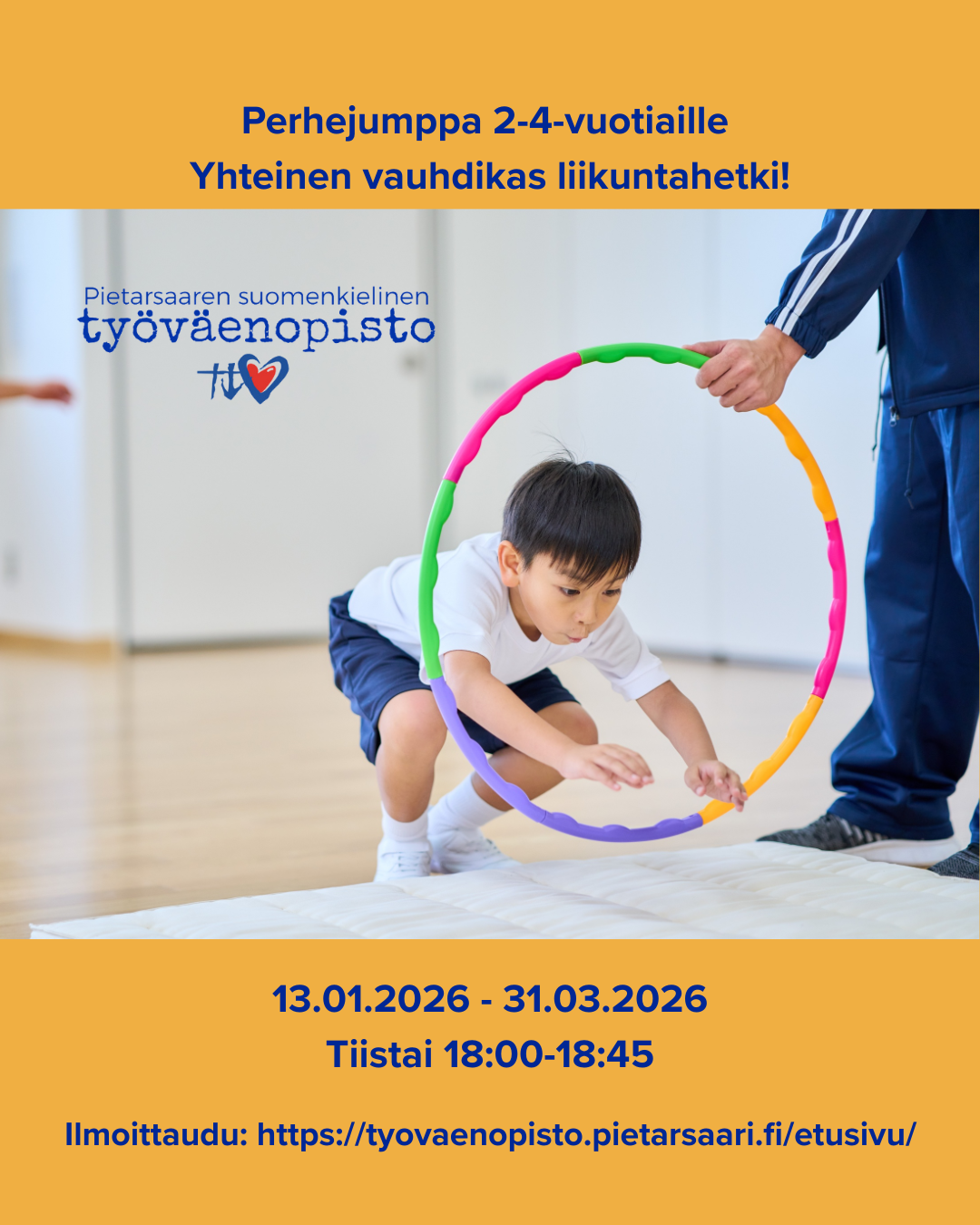 Yhden aikuisen ja 2-4 -vuotiaan lapsen yhteinen liikuntahetki, jossa liikutaan vauhdikkaasti lasten ehdoilla. Tunneilla leikitään liikuntaleikkejä, tehdään temppurataa, harjoitellaan erilaisilla liikuntavälineillä käsittelytaitoja ja liikutaan musiikin tahdissa. Aikuiset ovat aktiivisesti mukana innostamassa ja kannustamassa lasta liikkumaan. Jumpassa kehitetään lapsen perusliikuntataitoja, motoriikkaa ja sosiaalisuutta. Ilmoita lapsen nimi ilmoittautuessa. Kurssimaksu sisältää aikuisen ja lapsen osallistumisen. Sisaralennus viisi euroa.
